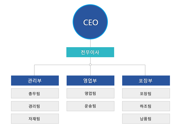 연혁/조직도 ▒ 회사개요(연혁) 회사명(주)김해수출포장 대표이사김승철 소재지 신주소) 경남 김해시 진례면 고모로 334-1 구주소) 경남 김해시 진례면 담안리 958-1 사업분야산업수출포장전문(목재, 진공, SKID번들) 대표전화055 - 346 - 1190 설립일2010년 4월 ▒ 조직도